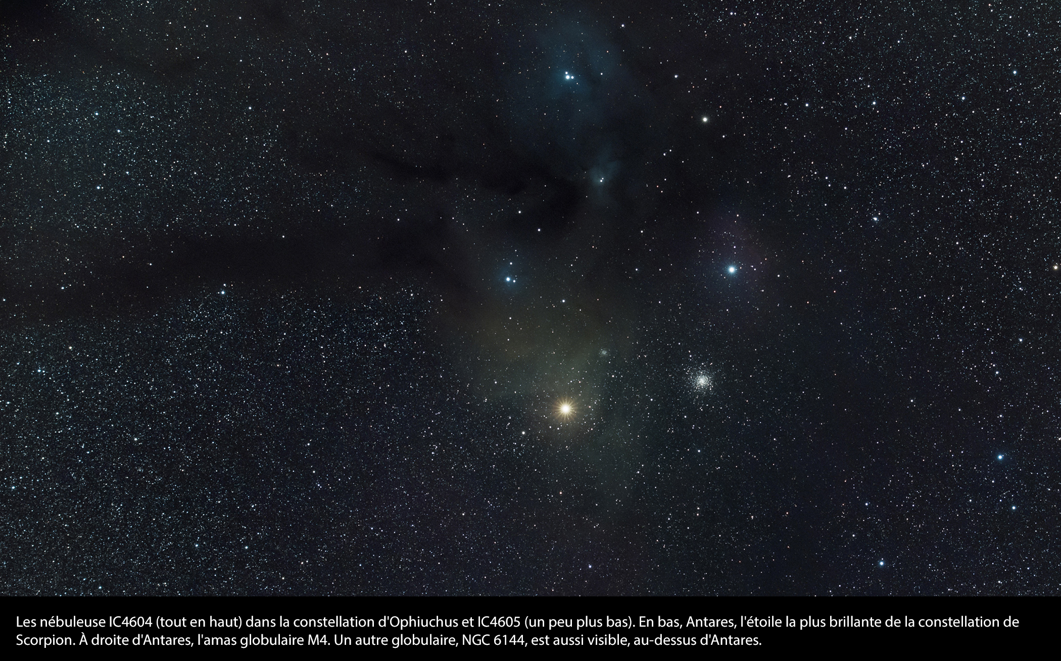 Antares-M4-IC4604-IC4605-large ← Précédent Suivant → Processing: Background neutralization Processing: Color Calibration Processing: Histogram Transf. (mid=0.001, lo=0.001, hi=1.000) Processing: Background extraction (Correction: Subtraction)